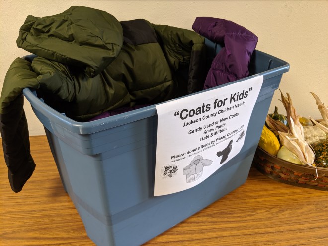 Fill the tote! It’s fall, and getting colder. We are collecting coats, mittens, gloves, and hats for Jackson County Coats for Kids through October 18th. Drop them off at church.